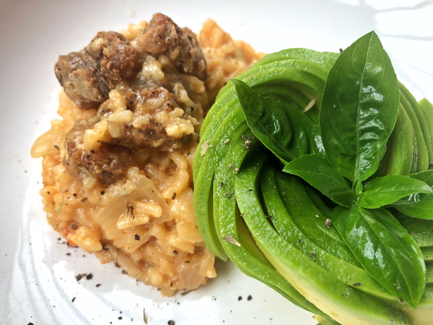 Asopao de Longaniza y rosa de aguacate y albahaca