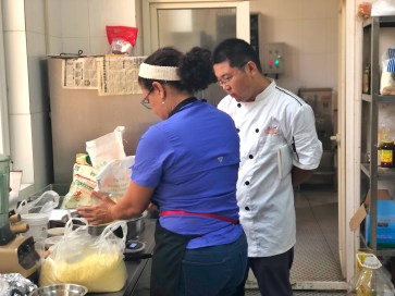 La sous chef Zobeira Gil enseñando al chef a preparar arepitas de maíz